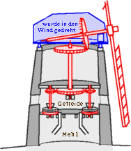 Die Drehbewegung wird über Zahnräder bis zu den drehbaren Mühlsteinen (rot) übertragen. Auf den drehbaren Mühlsteinen liegen die festen Mühlsteine, die in der Mitte das Einfülloch für das zu mahlende Getreide haben.